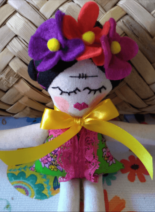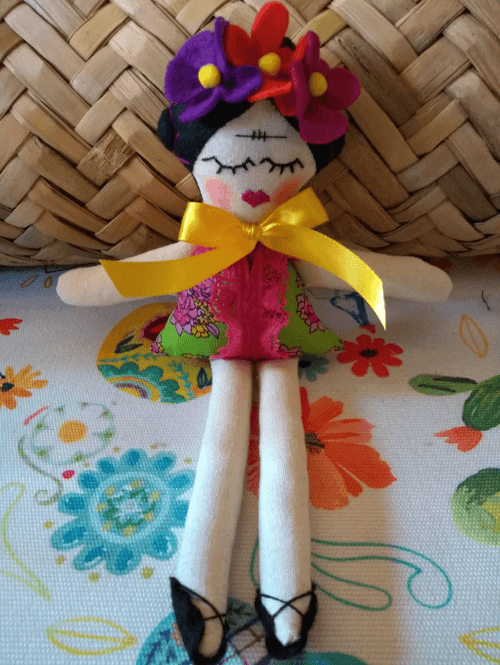 Muñequita elaborada en manta, fieltro, popelina estampada, bordado a mano.
